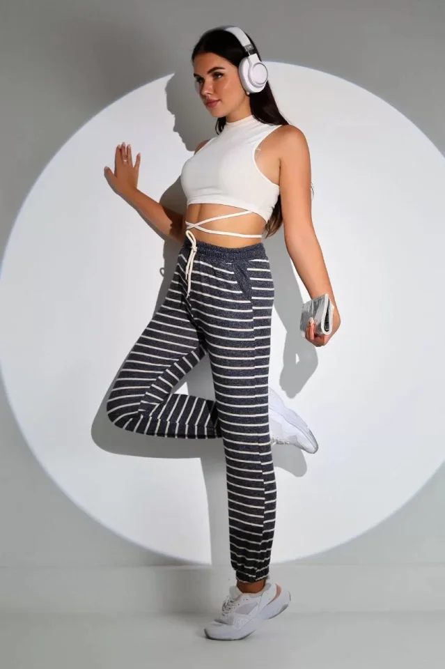 Beli Lastikli Çizgili Eşofman Alt - Siyah