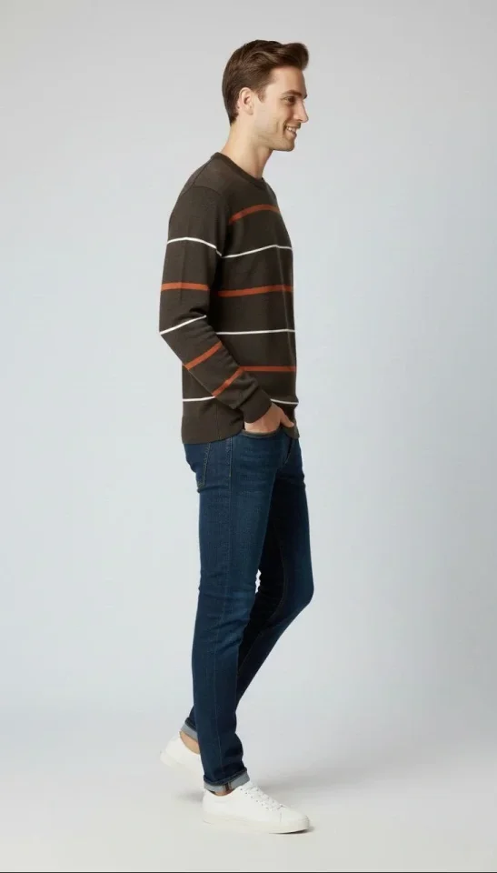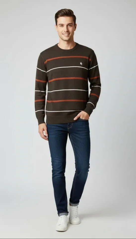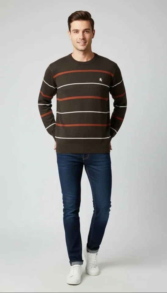 Erkek Bisiklet Yaka Cizgili Triko Kazak Yumuşak Dokulu Pamuklu Ince Dokuma, Uzun Kollu Rahat Regular Kalıp - Koyu Kahverengi