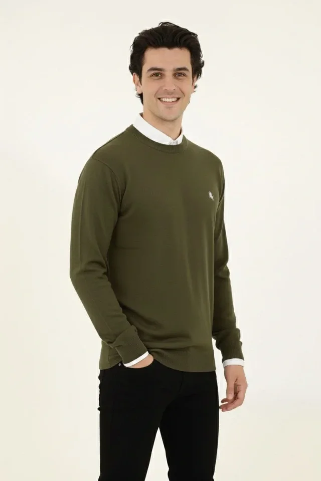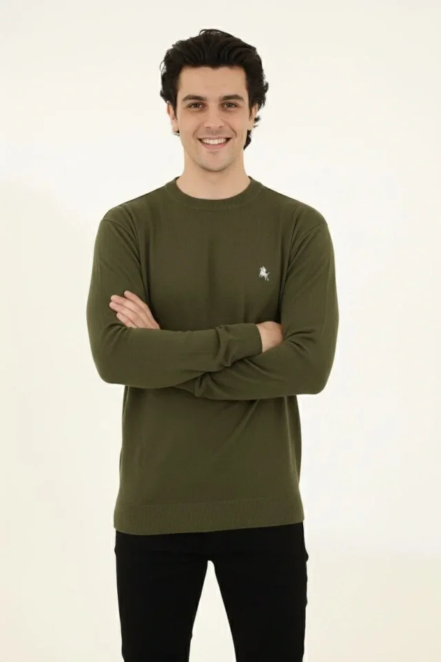 Erkek Bisiklet Yaka Nakış Işlemeli Triko Kazak Yumuşak Dokulu Pamuklu Ince Dokuma, Uzun Kollu Rahat Regular Kalıp - Haki