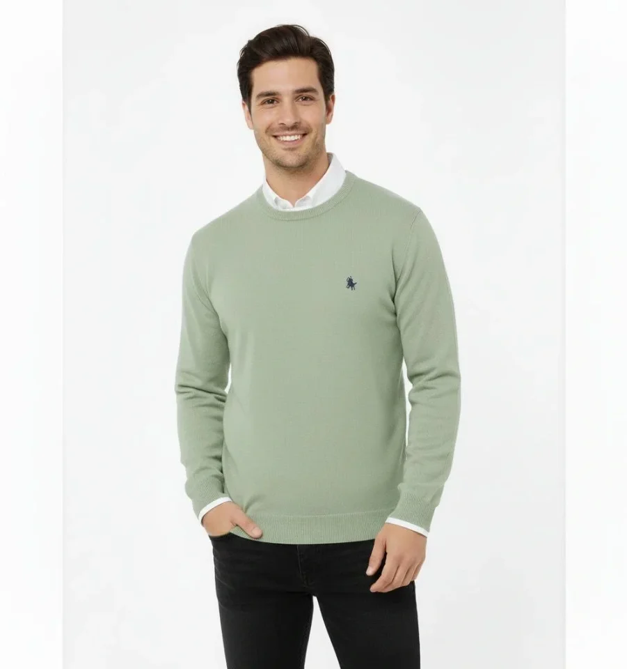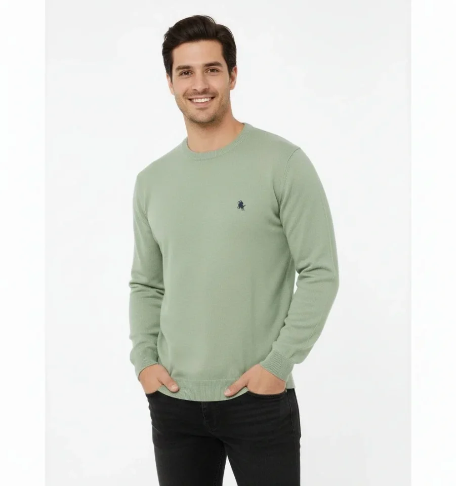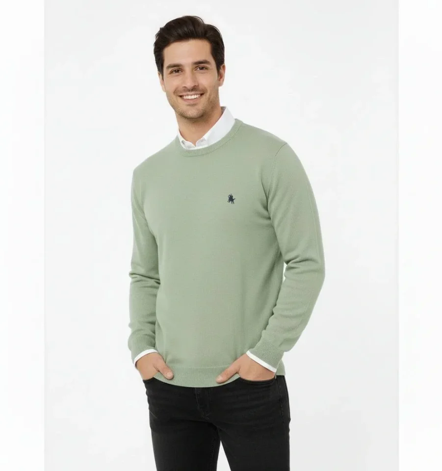 Erkek Bisiklet Yaka Nakış Işlemeli Triko Kazak Yumuşak Dokulu Pamuklu Ince Dokuma, Uzun Kollu Rahat Regular Kalıp - Mint Yeşili