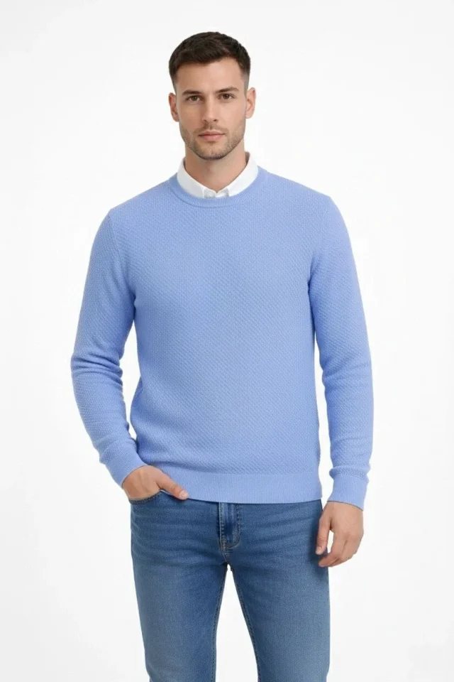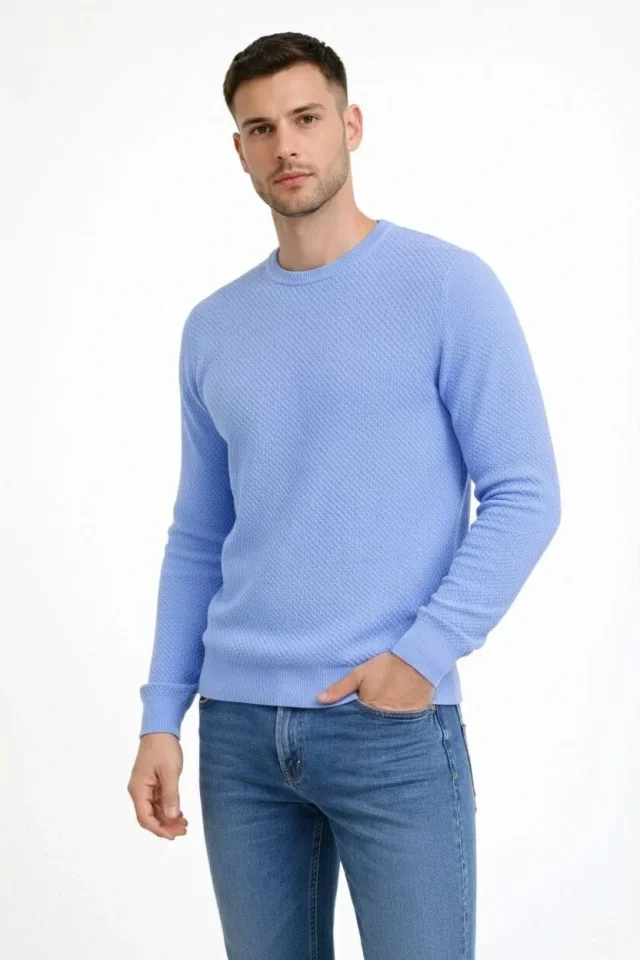 Erkek Bisiklet Yaka Petekli Dokulu Triko Kazak Pamuklu Ince Dokuma, Uzun Kollu Rahat Regular Kalıp - Mavi