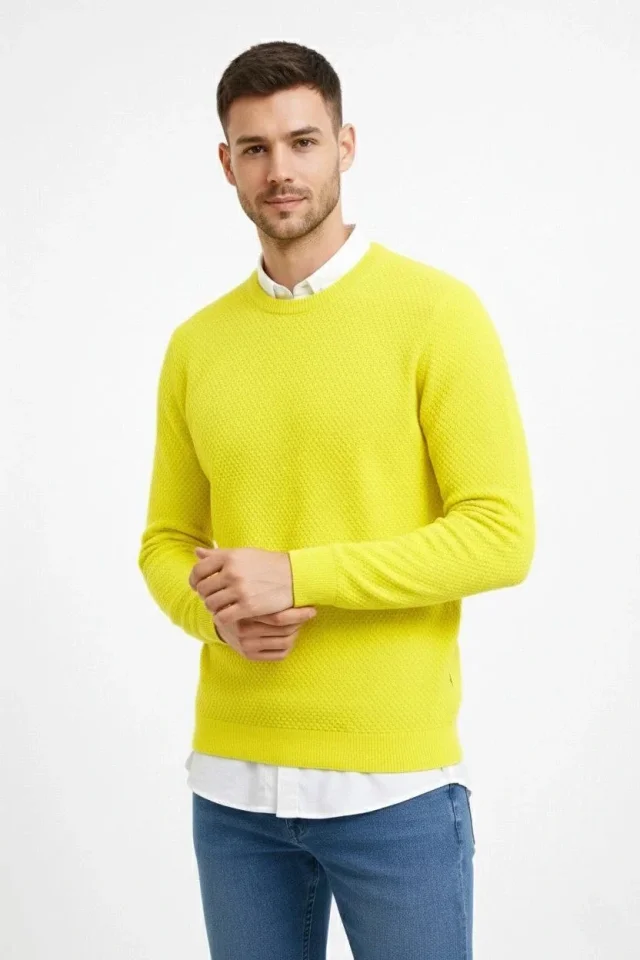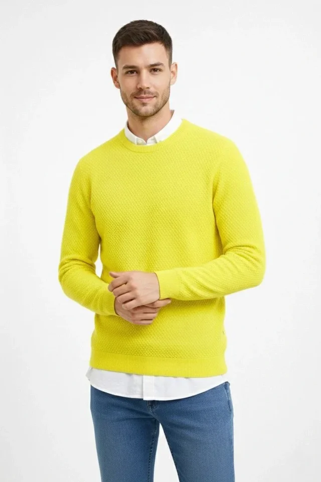 Erkek Bisiklet Yaka Petekli Dokulu Triko Kazak Pamuklu Ince Dokuma, Uzun Kollu Rahat Regular Kalıp - Sarı