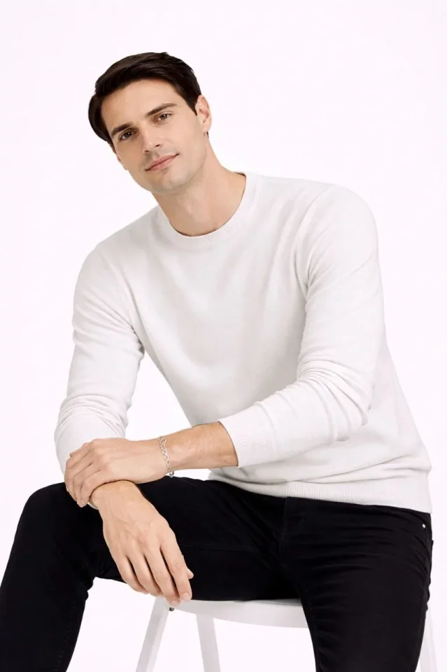 Erkek Bisiklet Yaka Triko Kazak Yumuşak Dokulu Pamuklu Ince Dokuma, Uzun Kollu Rahat Regular Kalıp - Beyaz