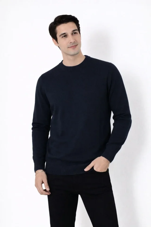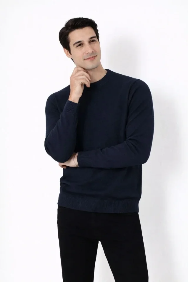 Erkek Bisiklet Yaka Triko Kazak Yumuşak Dokulu Pamuklu Ince Dokuma, Uzun Kollu Rahat Regular Kalıp - Lacivert