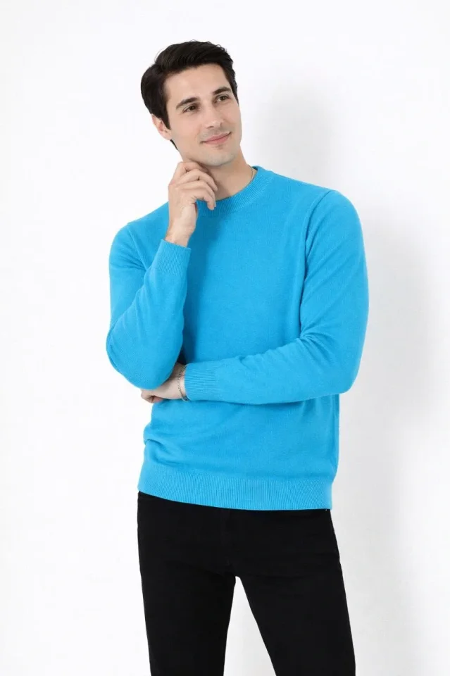 Erkek Bisiklet Yaka Triko Kazak Yumuşak Dokulu Pamuklu Ince Dokuma, Uzun Kollu Rahat Regular Kalıp - Mavi