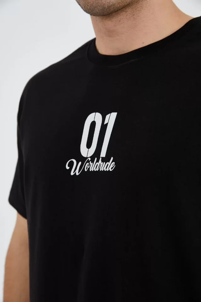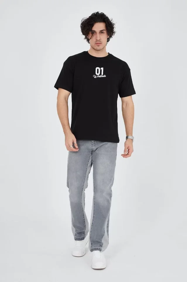 Erkek Bisiklet Yakalı Baskılı T-Shirt - Siyah