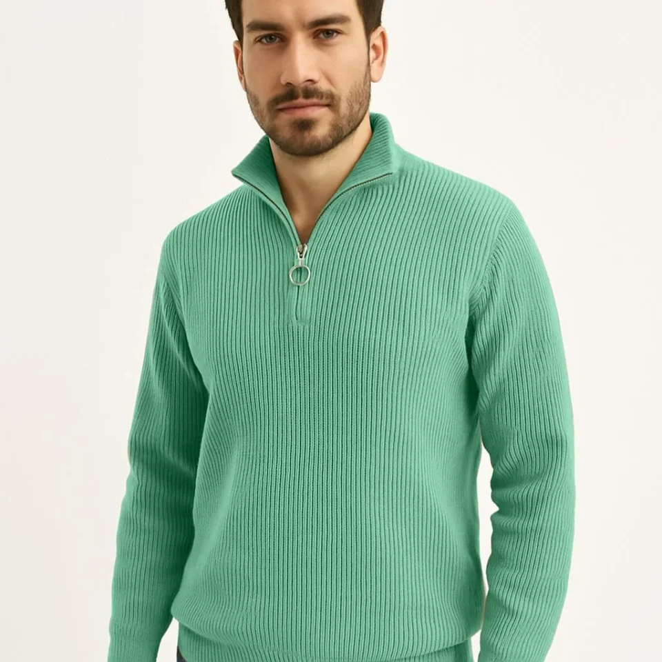 Erkek Fitilli Triko Kazak 2’li Set – Mint Yeşili - Siyah, Kalın Dokuma Pamuklu Regular Fit V Yaka Fermuarlı Uzun Kollu Rahat Kışlık Kazak Kombini