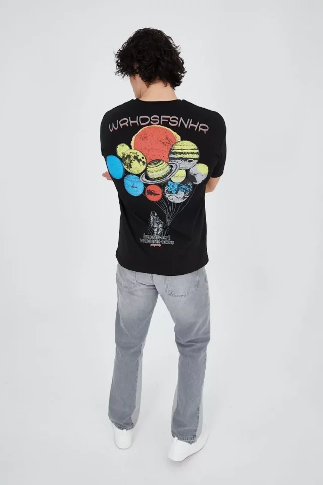 Erkek Penye Baskılı T-Shirt - Siyah