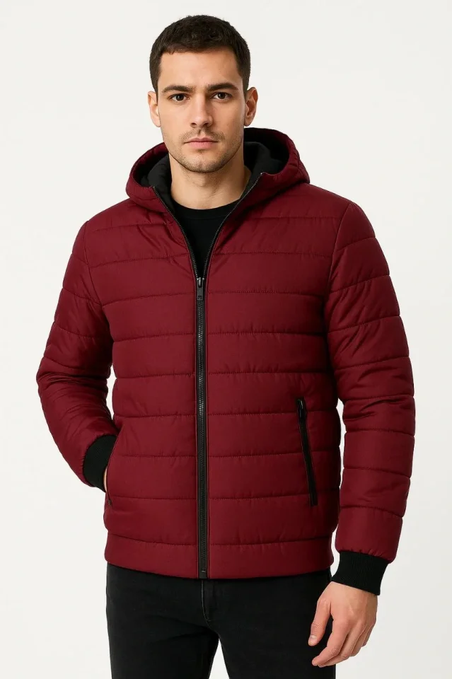 Erkek Şişme Kapüşonlu Fermuarlı Mont Su Itici Kapitone Astarlı Kumaş Cepli Kışlık Rahat Kalıp - Bordo