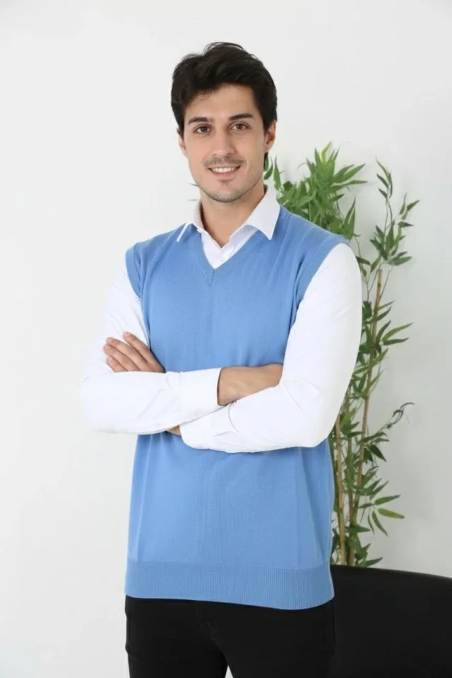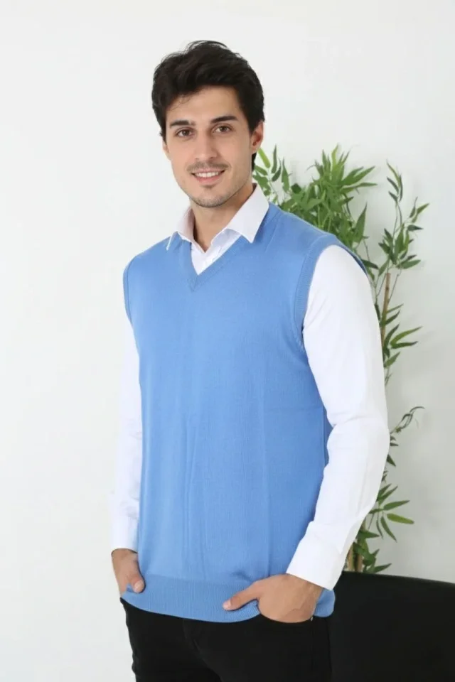 Erkek V Yaka Kolsuz Süveter Triko Kazak Yumuşak Dokulu Pamuklu Ince Dokuma Rahat Regular Kalıp - Mavi