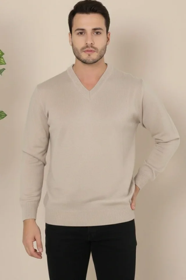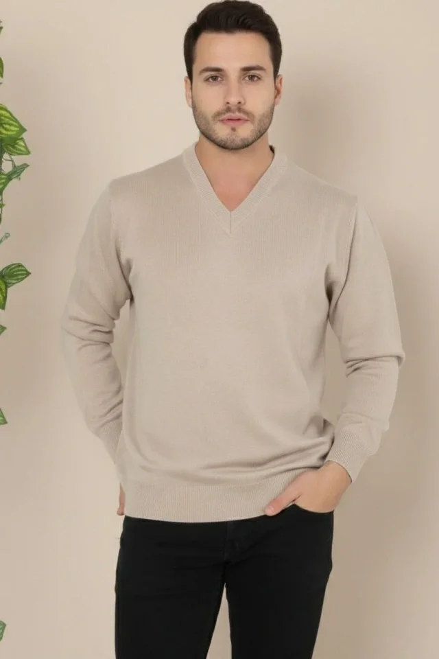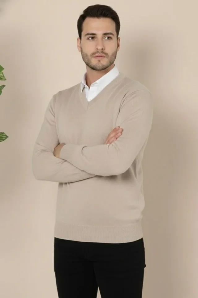 Erkek V Yaka Triko Kazak Yumuşak Dokulu Pamuklu Ince Dokuma, Uzun Kollu Rahat Regular Kalıp - Bej