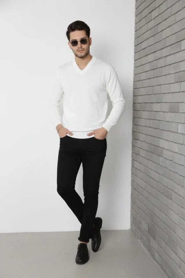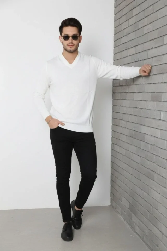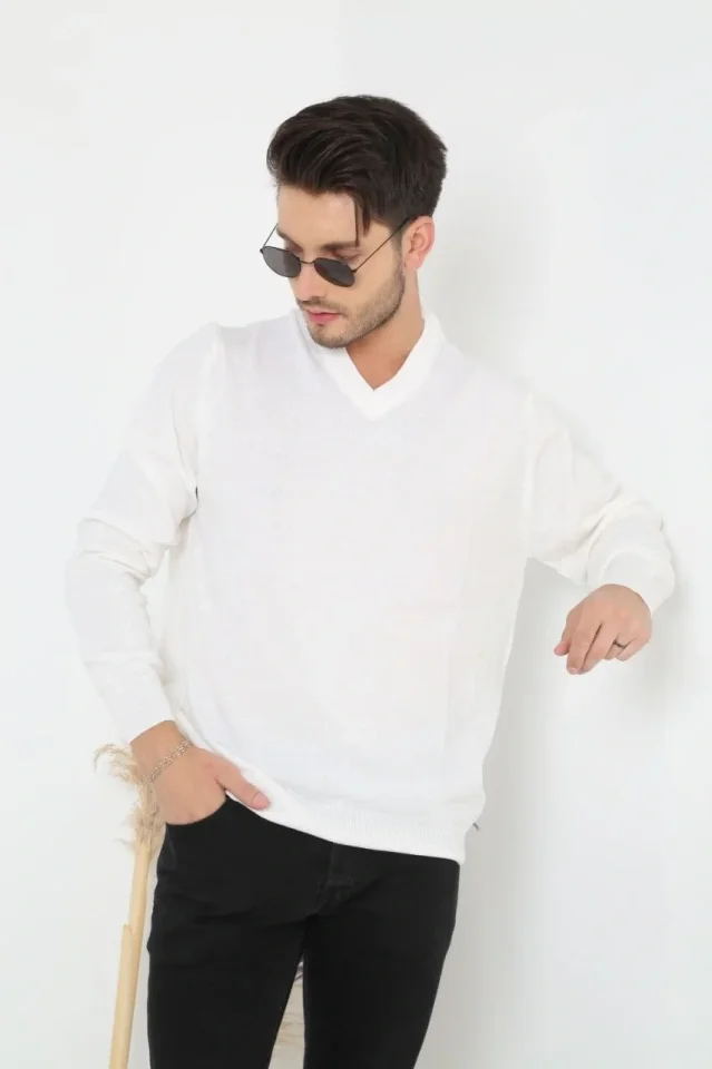 Erkek V Yaka Triko Kazak Yumuşak Dokulu Pamuklu Ince Dokuma, Uzun Kollu Rahat Regular Kalıp - Beyaz
