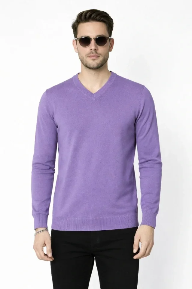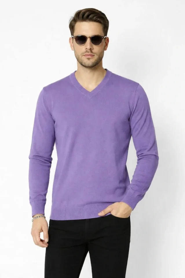 Erkek V Yaka Triko Kazak Yumuşak Dokulu Pamuklu Ince Dokuma, Uzun Kollu Rahat Regular Kalıp - Mor