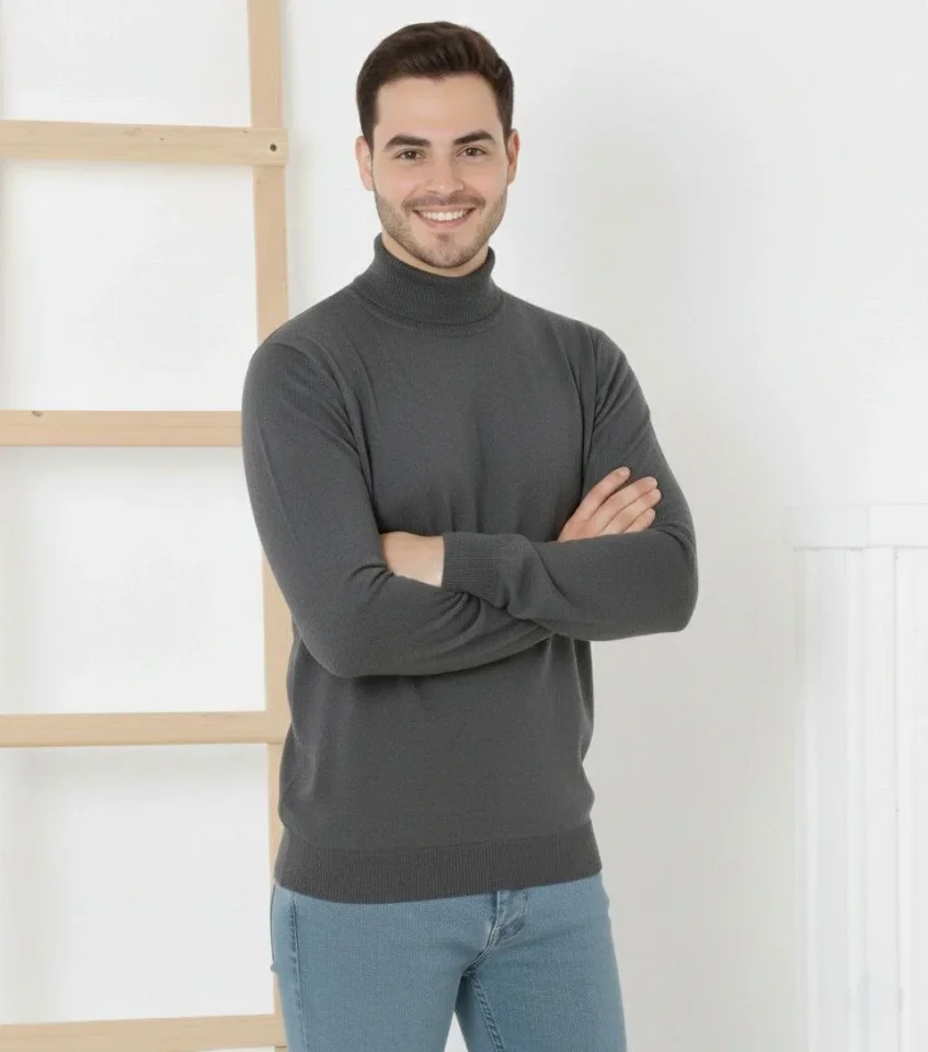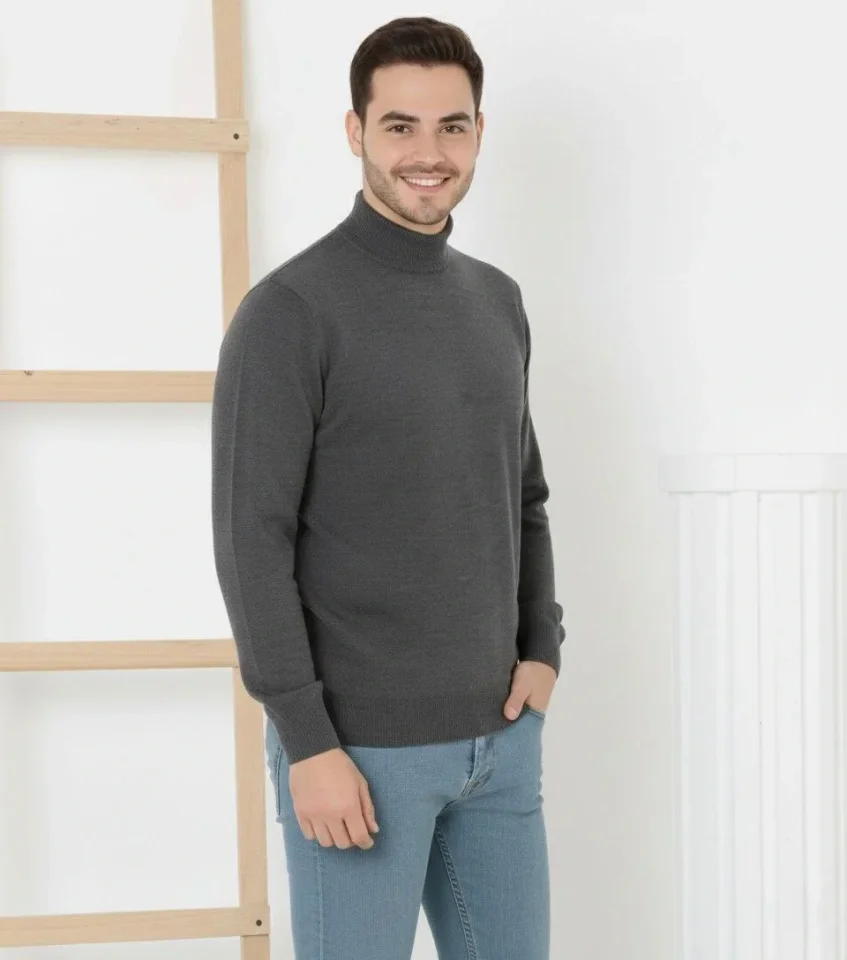 Erkek Yarım Boğaz Triko Kazak Yumuşak Dokulu Pamuklu Ince Dokuma, Uzun Kollu Rahat Regular Kalıp - Füme