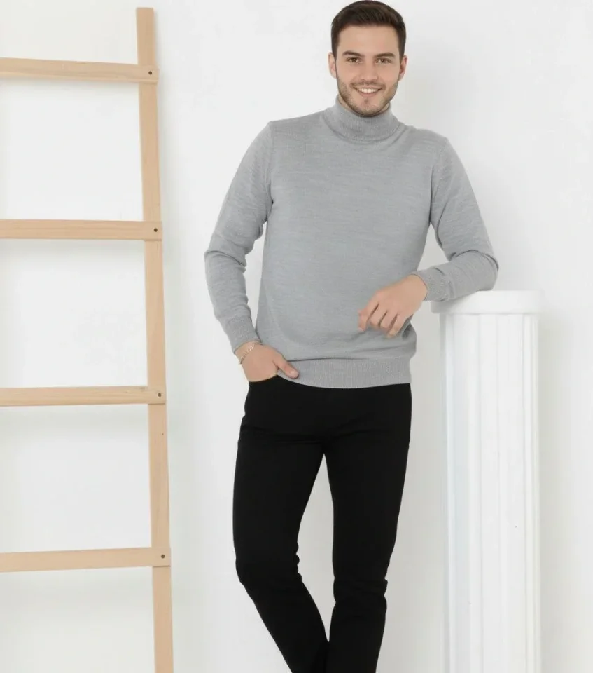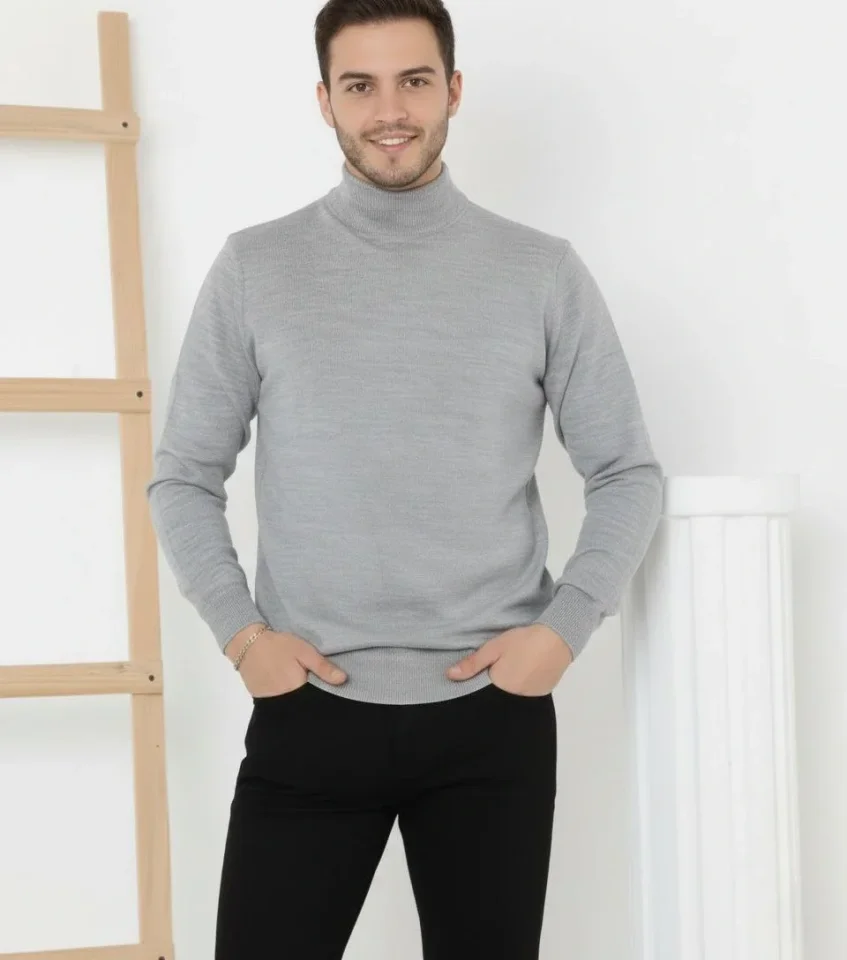 Erkek Yarım Boğaz Triko Kazak Yumuşak Dokulu Pamuklu Ince Dokuma, Uzun Kollu Rahat Regular Kalıp - Gri
