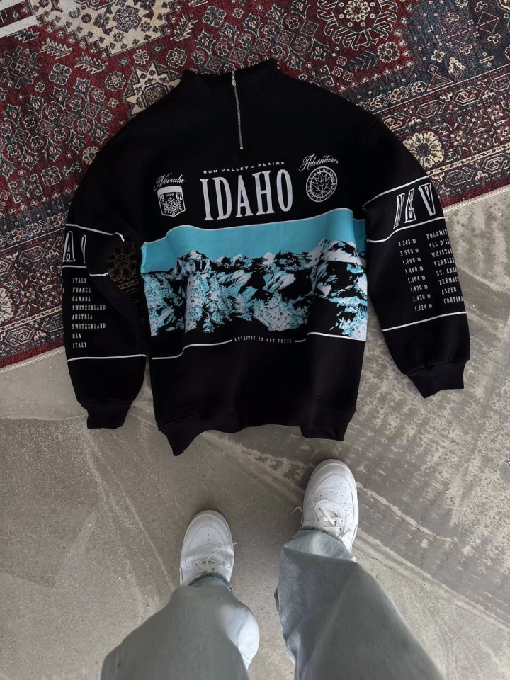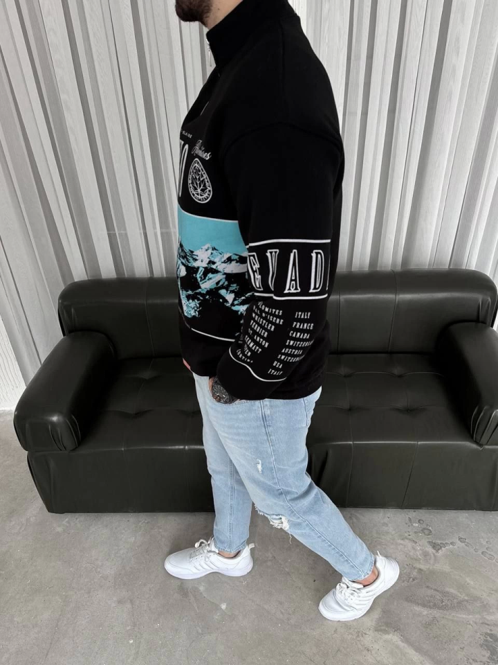Erkek Yarım Fermuarlı Oversize Baskılı SweatShirt - Siyah