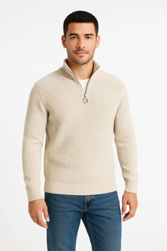 Erkek Yarım Fermuarlı Triko Kazak – Selanik Örgü, Dik Yaka, Pamuklu Dokuma, Regular Fit Uzun Kollu Kışlık Model - Bej
