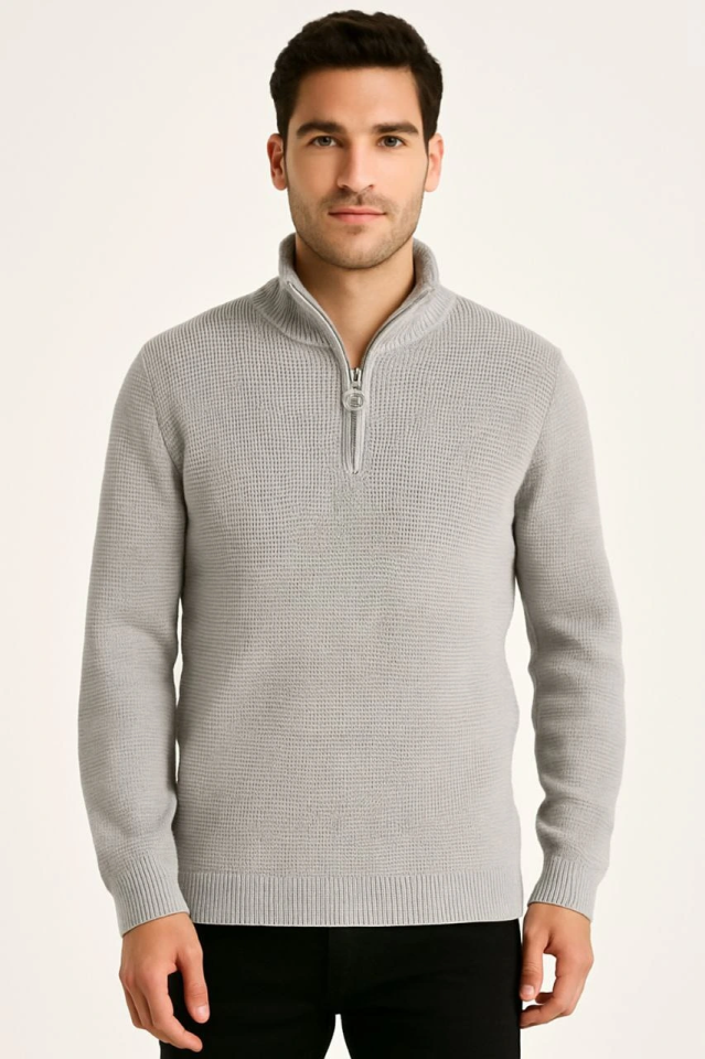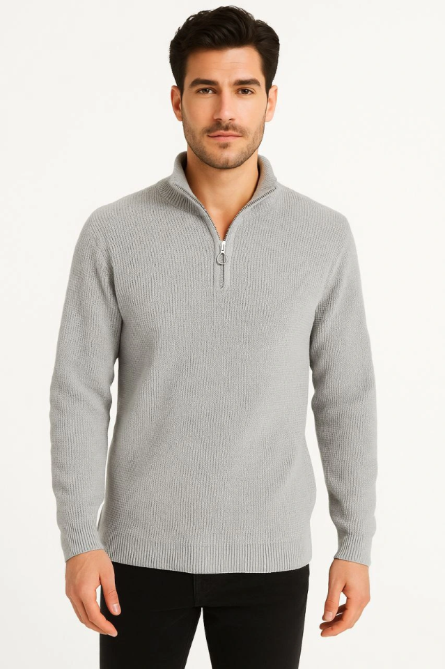 Erkek Yarım Fermuarlı Triko Kazak – Selanik Örgü, Dik Yaka, Pamuklu Dokuma, Regular Fit Uzun Kollu Kışlık Model - Gri