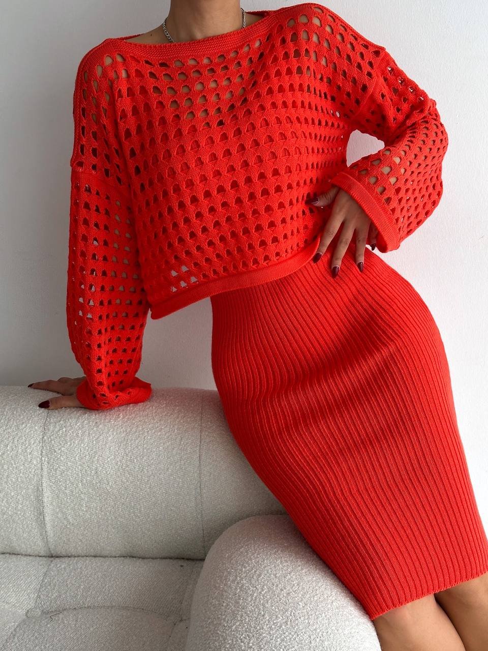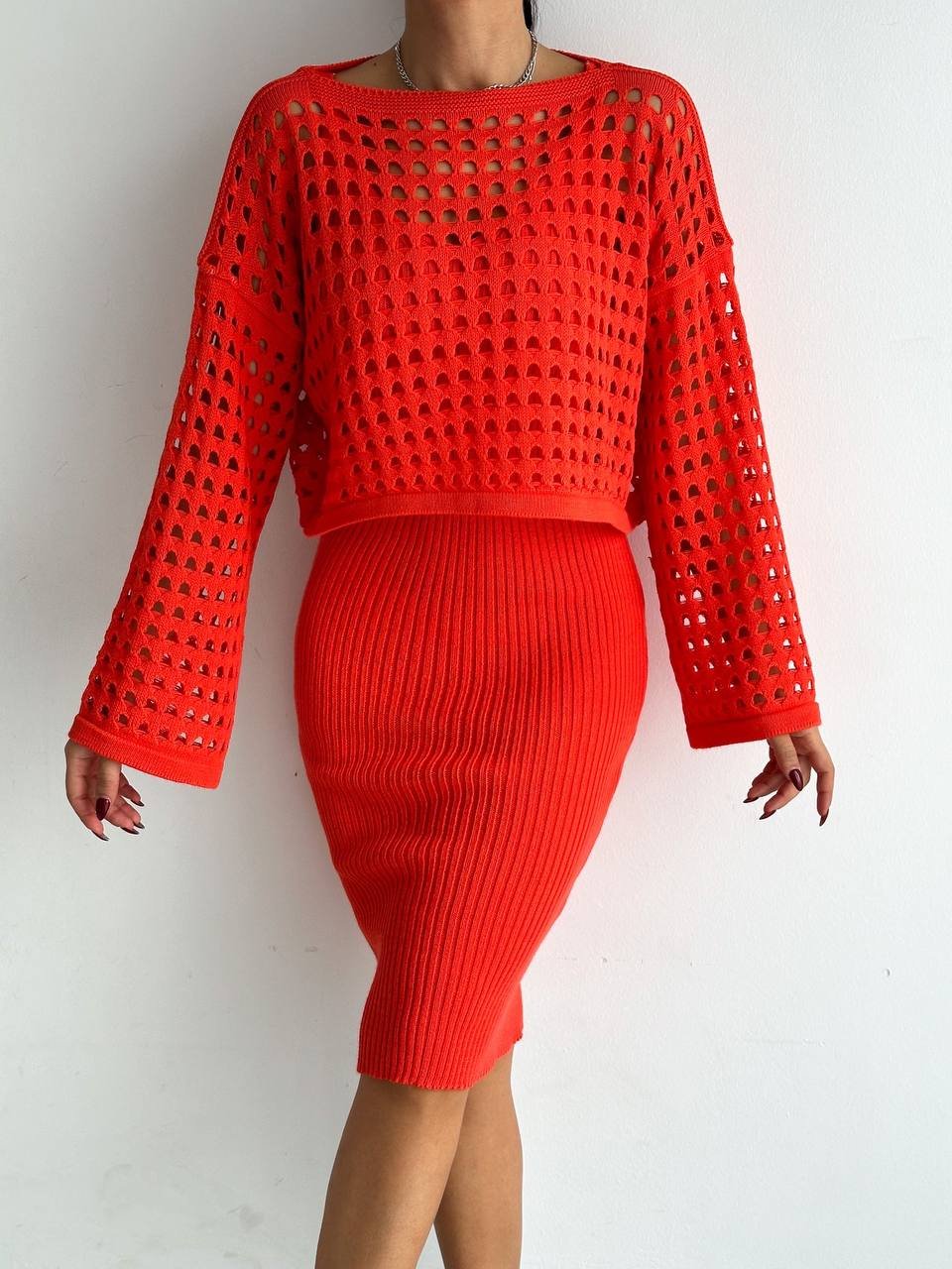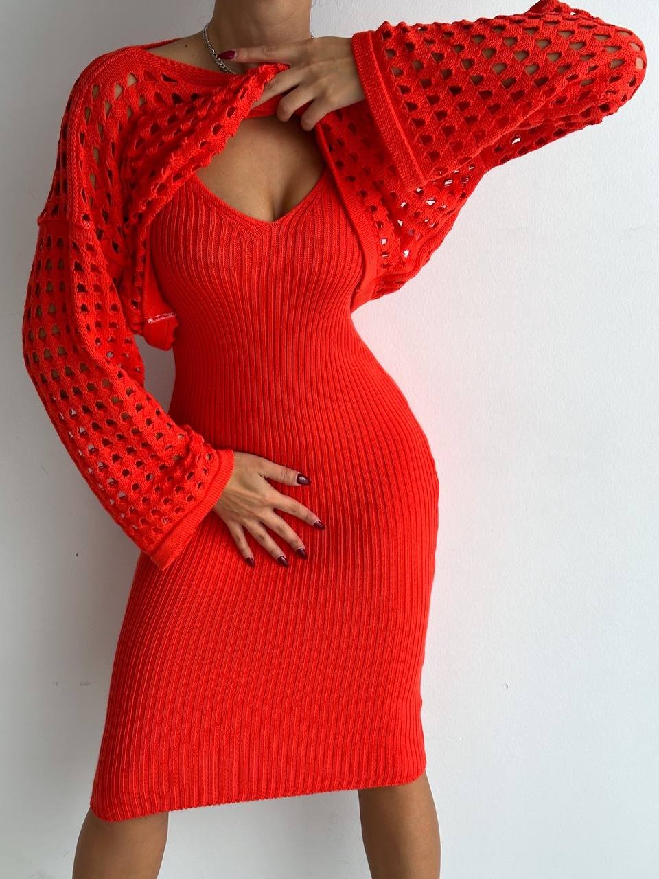 Kadın Delikli Kazak Askılı Elbise Triko Kumaş Ikili Takım