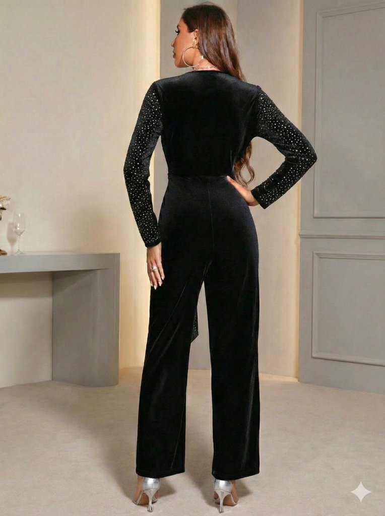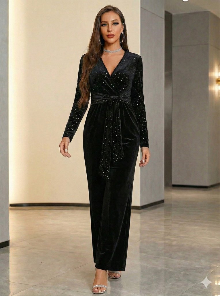 Kadın Uzun Kollu Kruvaze Yakalı Belden Kuşaklı ışıltılı Kadife Tulum