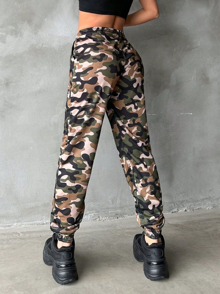 Kadın Yüksek Bel Kamuflaj Baskılı Bileği Lastik Detay İki İplik Pantolon