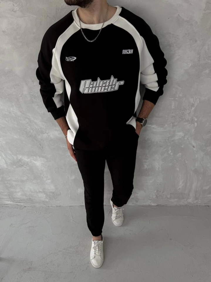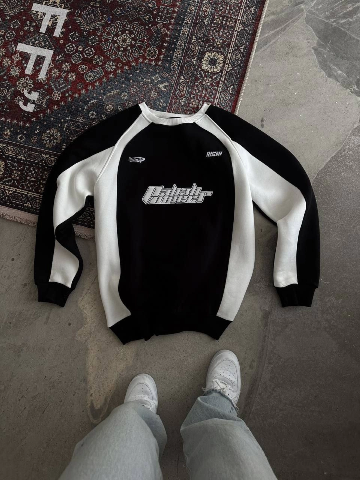 Kışlık Nakış İşlemeli Bisiklet Yaka Parçalı SweatShirt - Siyah