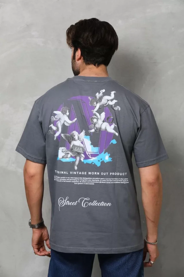 Unisex Bisiklet Yaka Baskılı Oversize T-Shirt - Füme