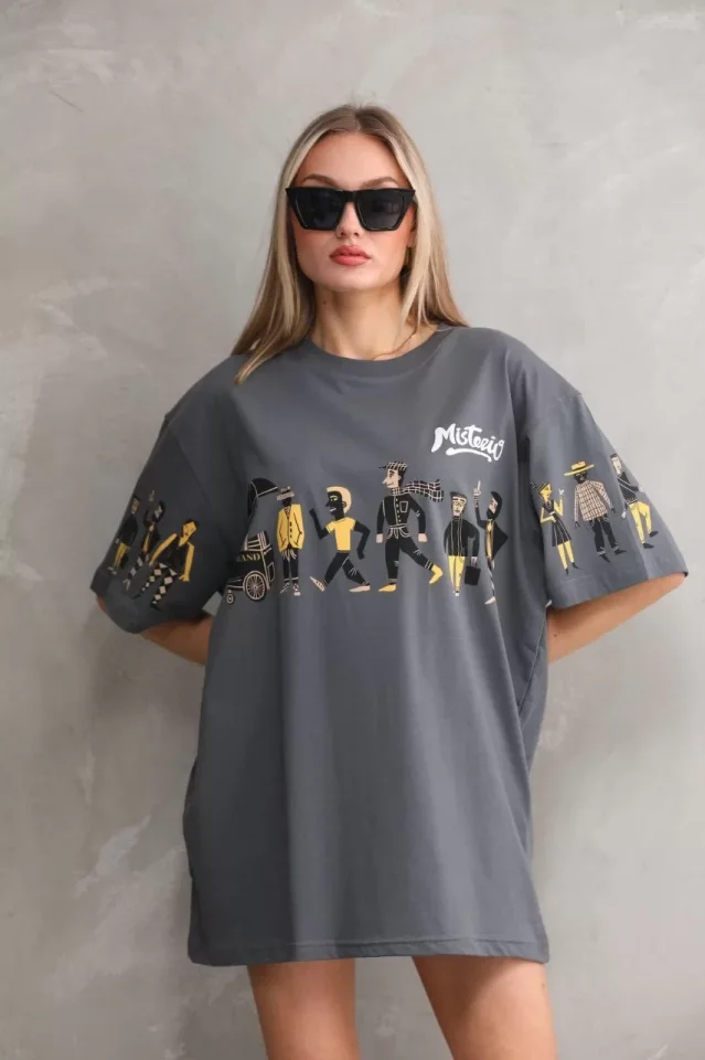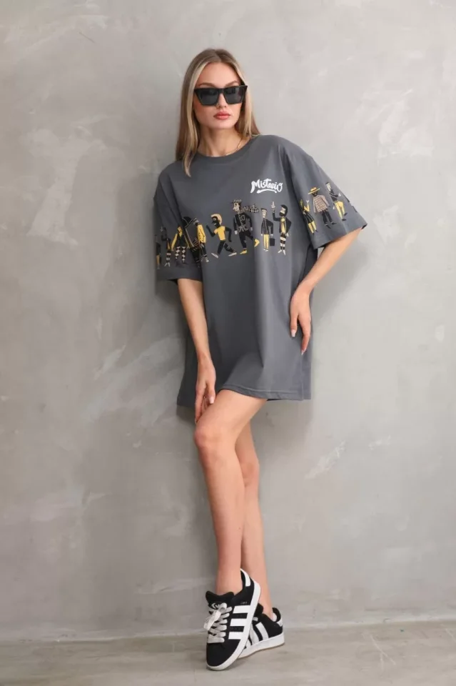 Unisex Bisiklet Yaka Baskılı Oversize T-Shirt - Gri