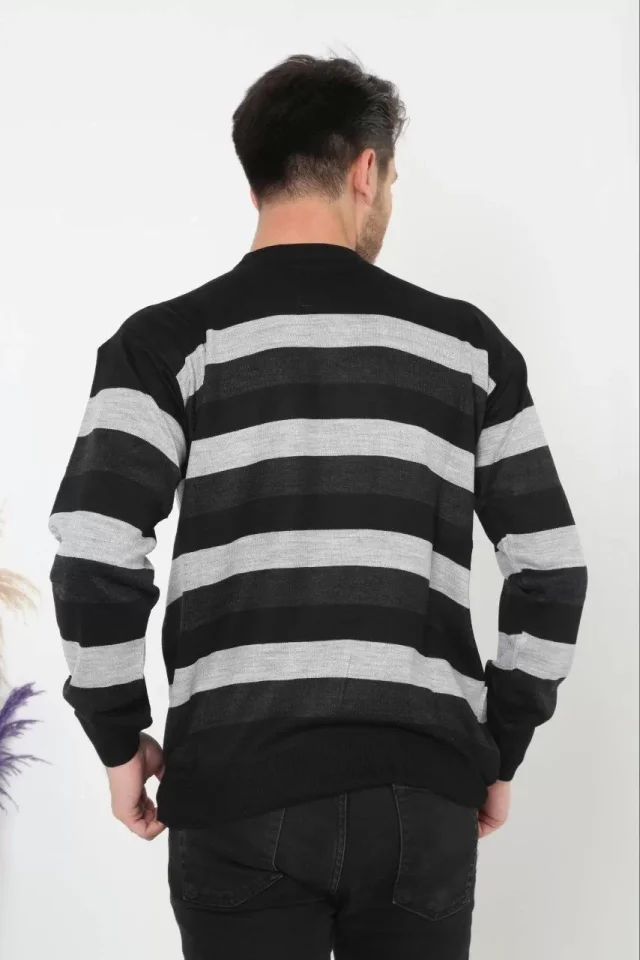 Unisex Kalın Çizgili Bisiklet Yaka Triko Kazak - Füme