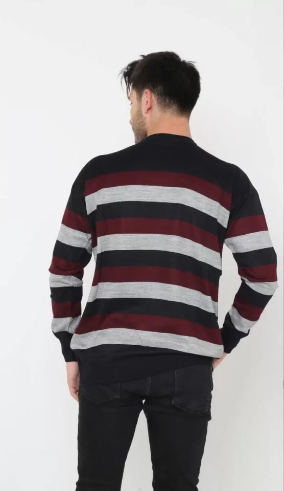 Unisex Kalın Çizgili Bisiklet Yaka Triko Kazak - Gri