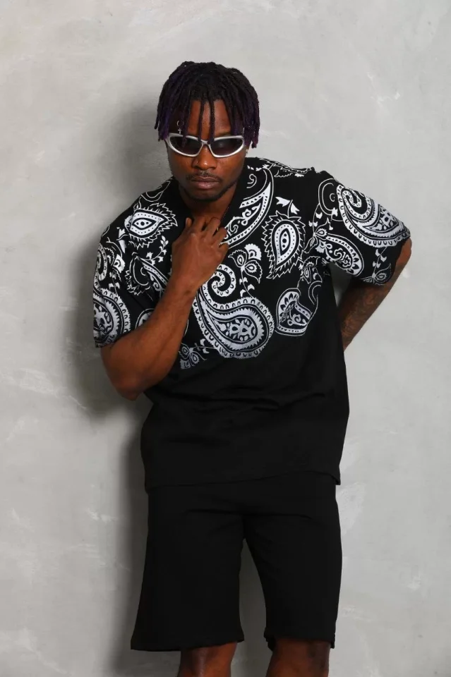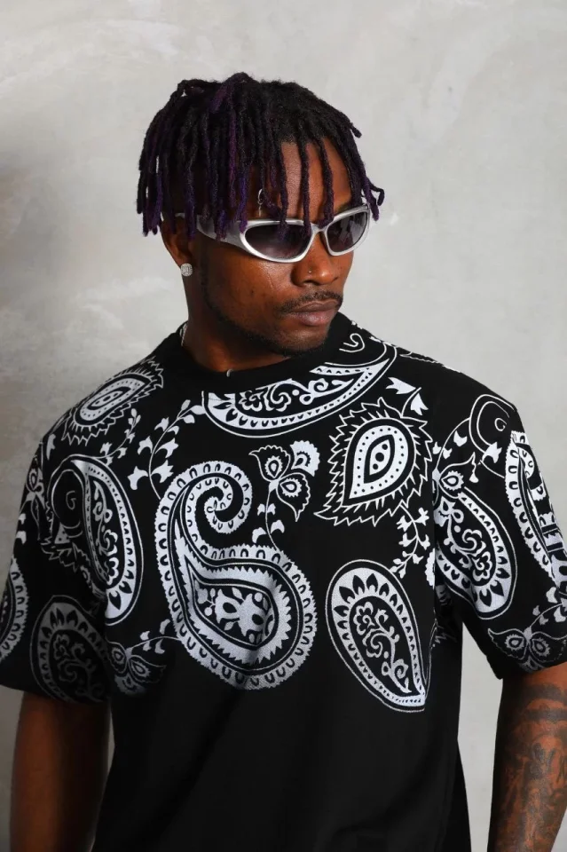 Unisex Oversize Baskılı Bisiklet Yaka T-Shirt - Siyah
