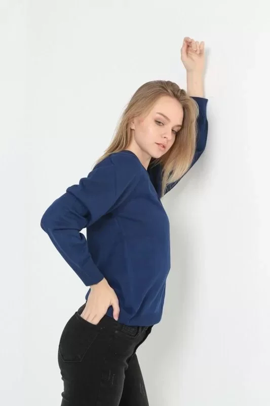 Unisex Uzun Kol V Yaka Triko Kazak - Indigo