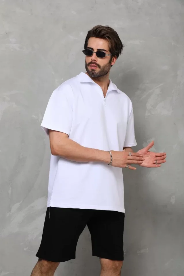 Unisex Yarım Fermuarlı Düz Oversize T-shirt - Beyaz