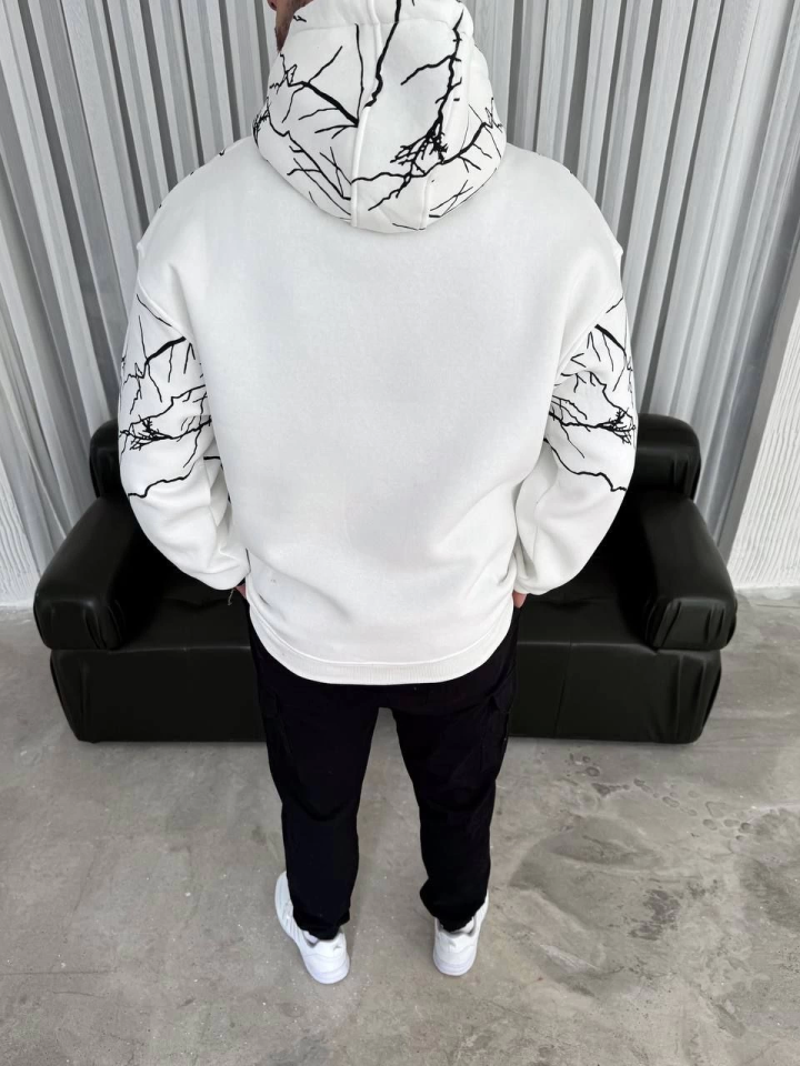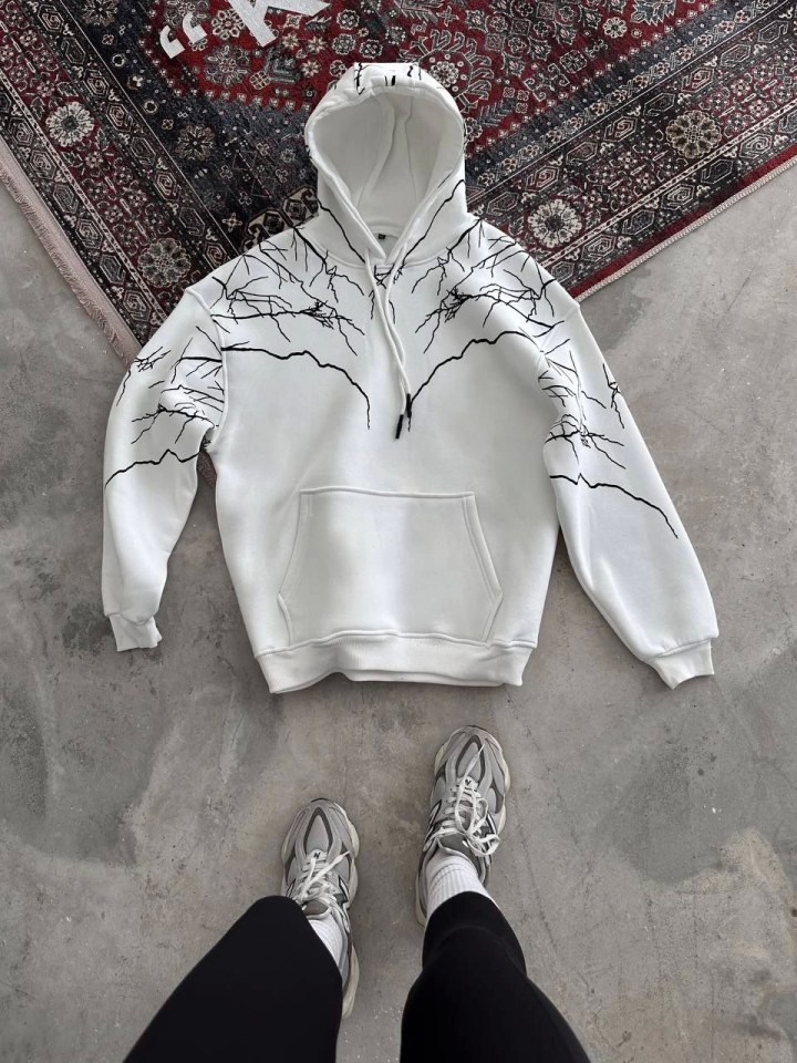 Yıldırım Baskılı Kapşonlu SweatShirt - Beyaz