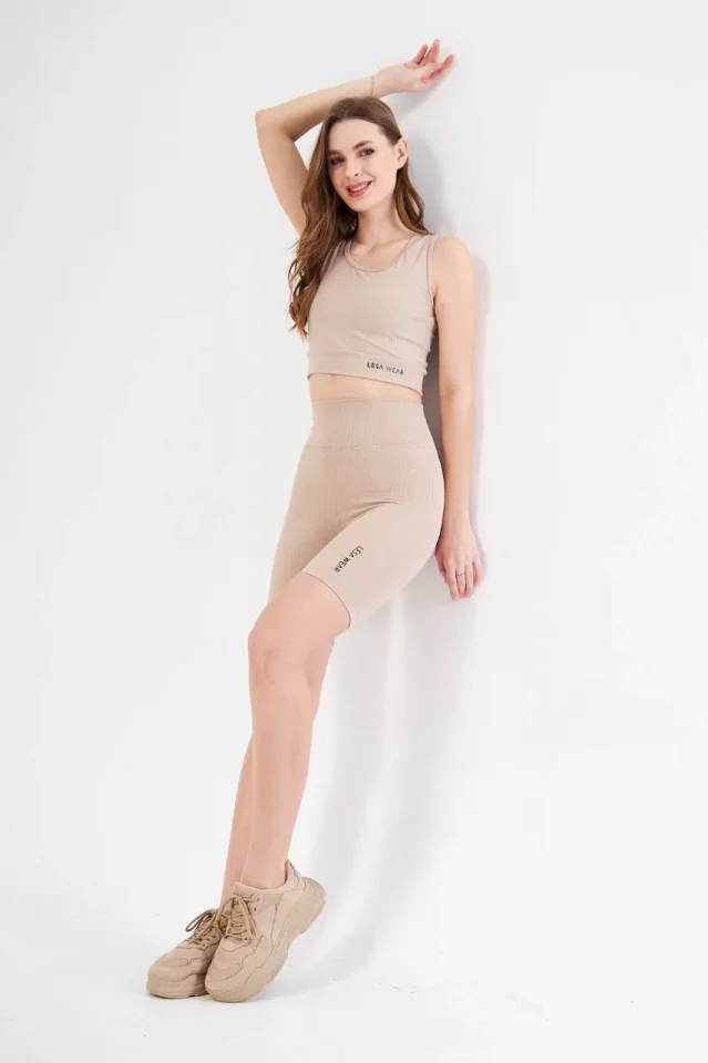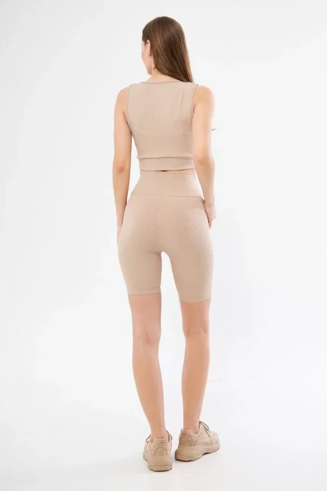 Yüksek Bel Fitilli Croplu Biker Şortlu Takım - Bej